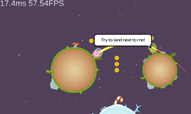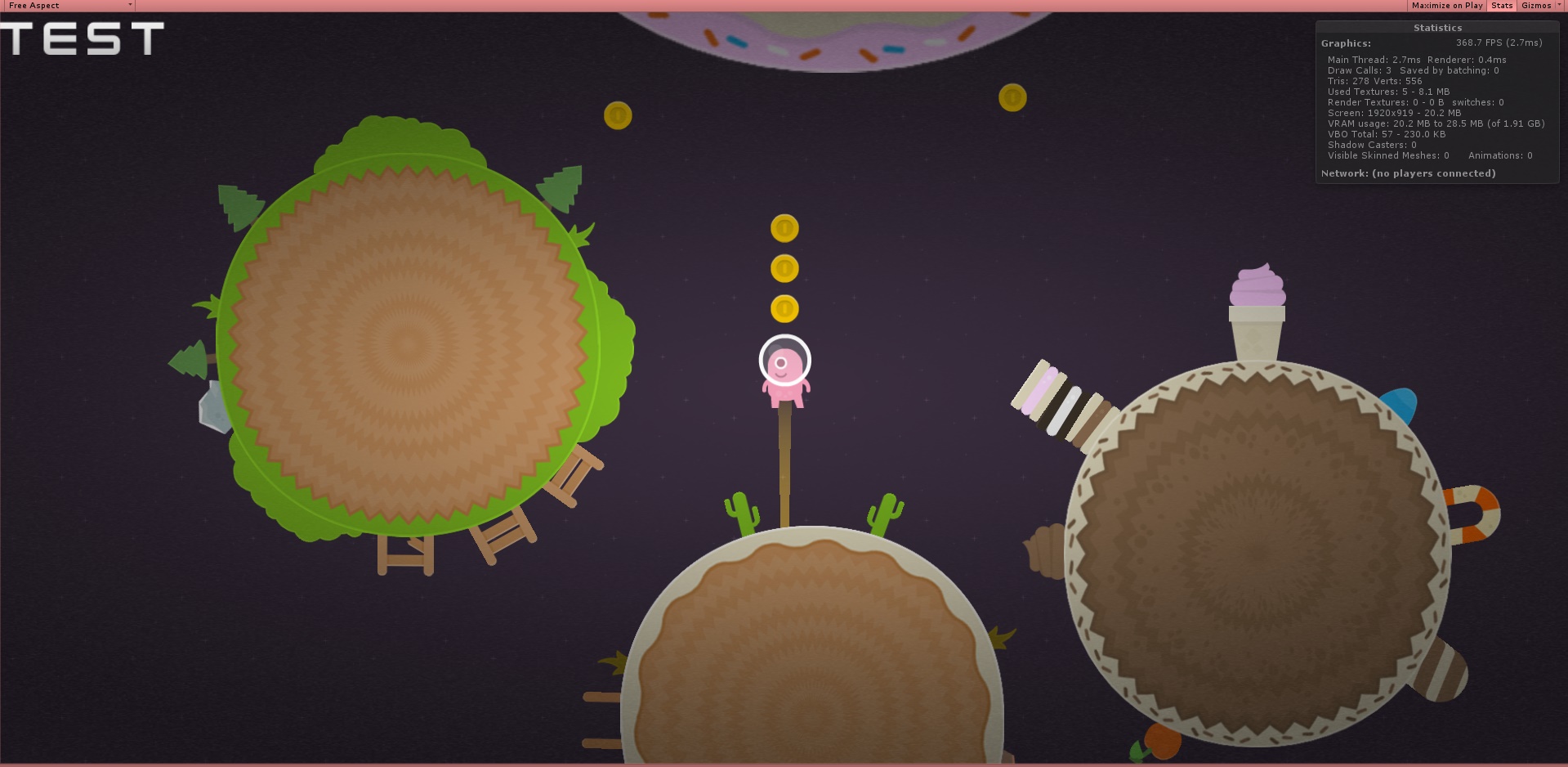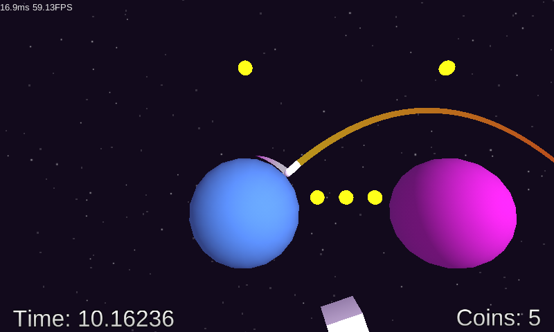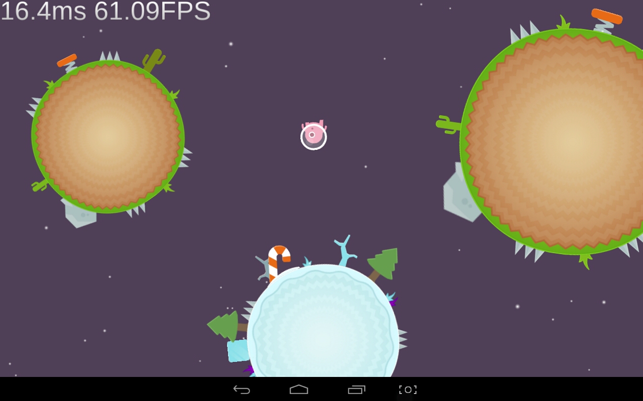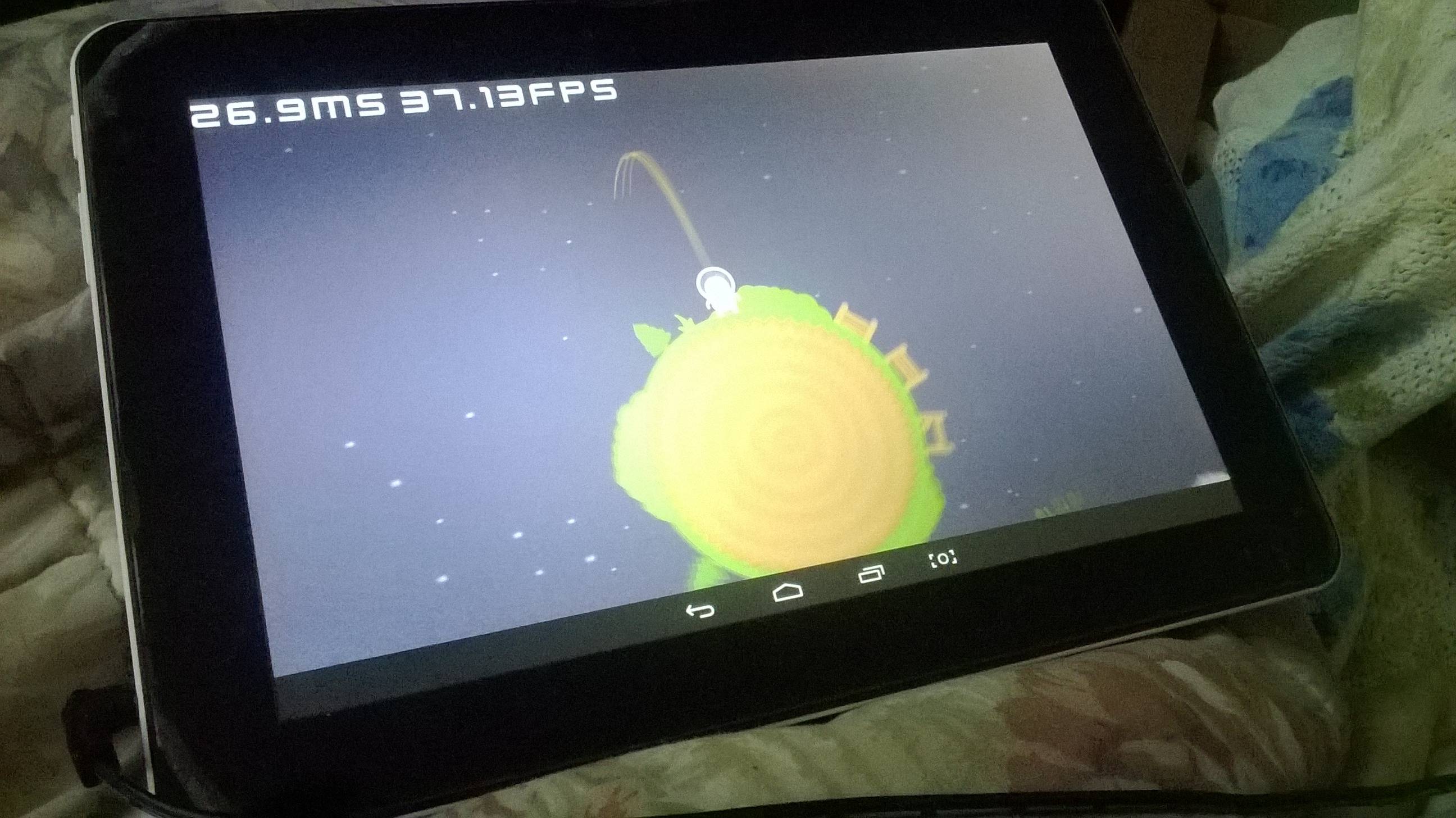 I thought it was a nice mechanic. I had played a game with something similar that involved running from the sun and jumping from planet to planet. I exported this and ran it on my tablet. The performance wasn’t bad because the scene is really basic. This is a little different from any other time I’ve played with Android, because in general, everything I make runs like shit. Fill rate and full 3D scenes make my tablet cry.